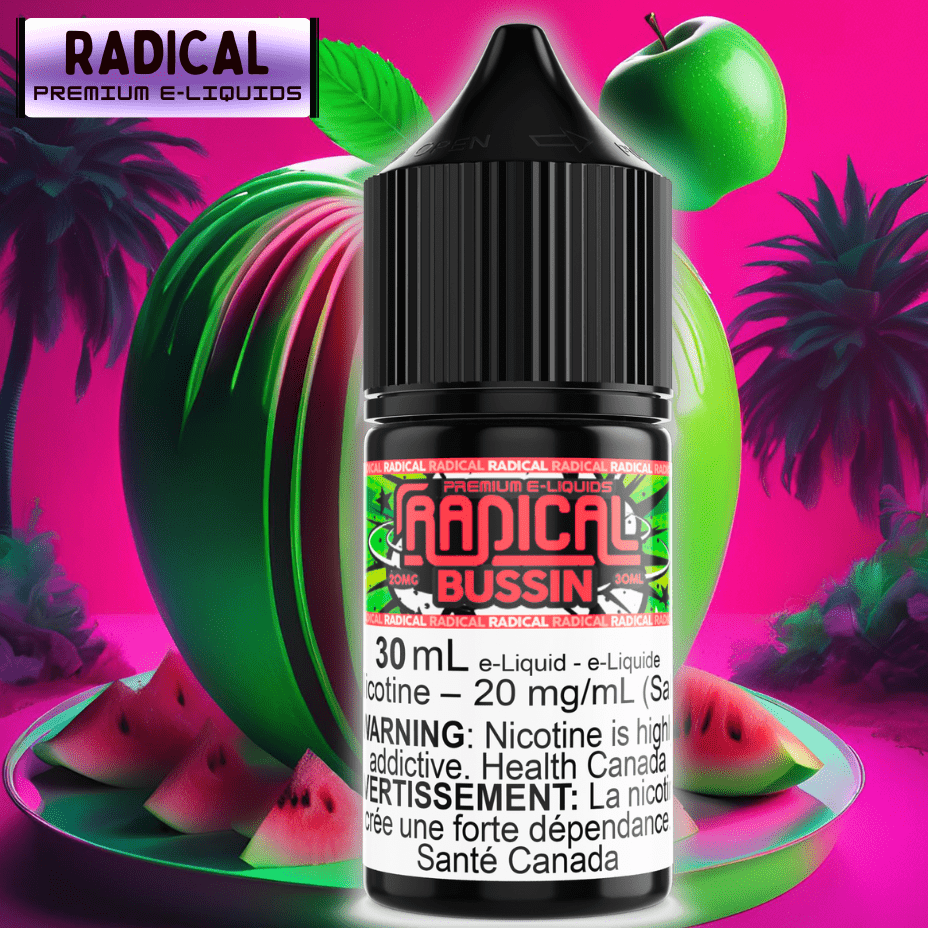 Bussin Salt Nic by Radical E-liquid in a Canada made e-liquid. Dive into this irresistible combination of sweet watermelon treats accented by subtle notes of sour green apple. This flavour is as addicting as it sounds. Every puff will make you want another, all while being incredibly clean and easy on your pods and coils.