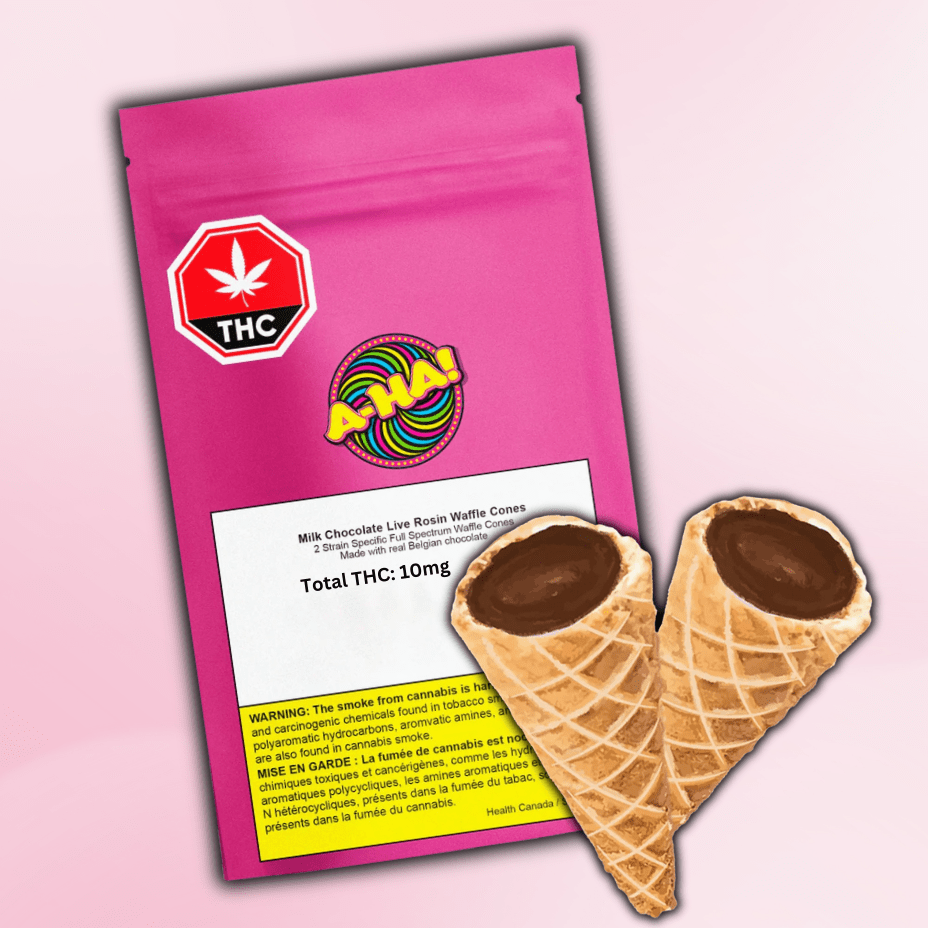 A-ha Milk Chocolate Live Rosin Waffle Cones are here to put the nostalgia into cannabis edibles! Enjoy two waffle cones filled with REAL Belgian Milk Chocolate infused with premium full spectrum live rosin with a sweet crunch of waffle in every bite.