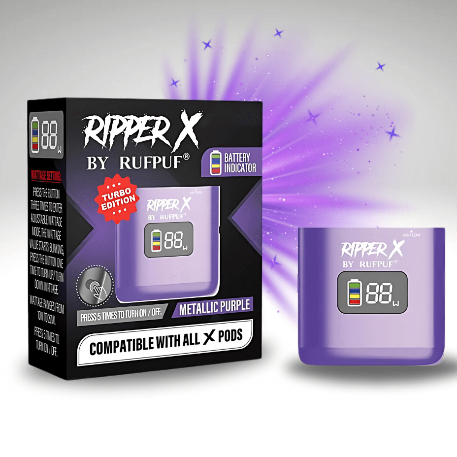 RufPuf Ripper X reusable batteries are 1,000mAh rechargeable vape. This is a super easy device to vape because it is auto-draw and has adjustable wattage button on the left side of the device. With an ultra-adjustable airflow easiest vape starter kit but it is also great for people transitioning off disposable vapes.