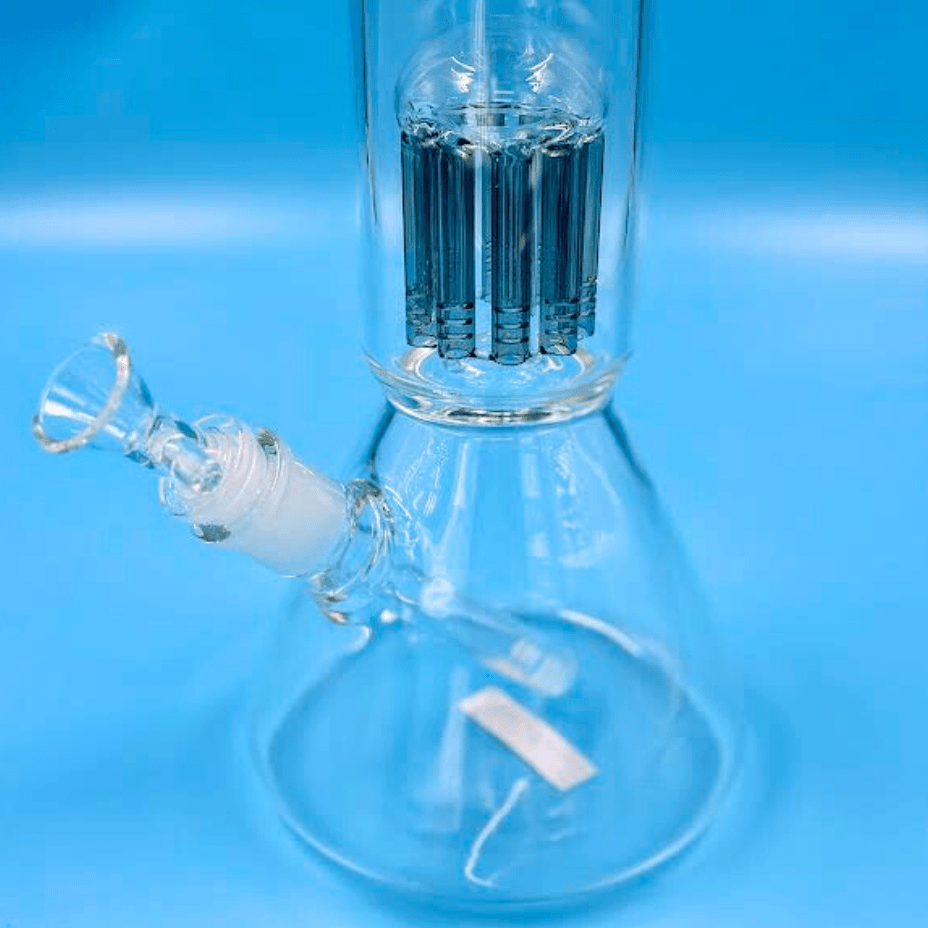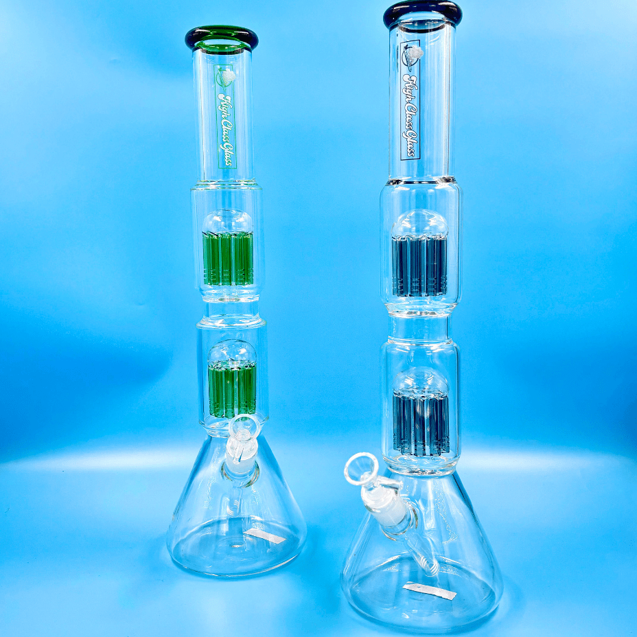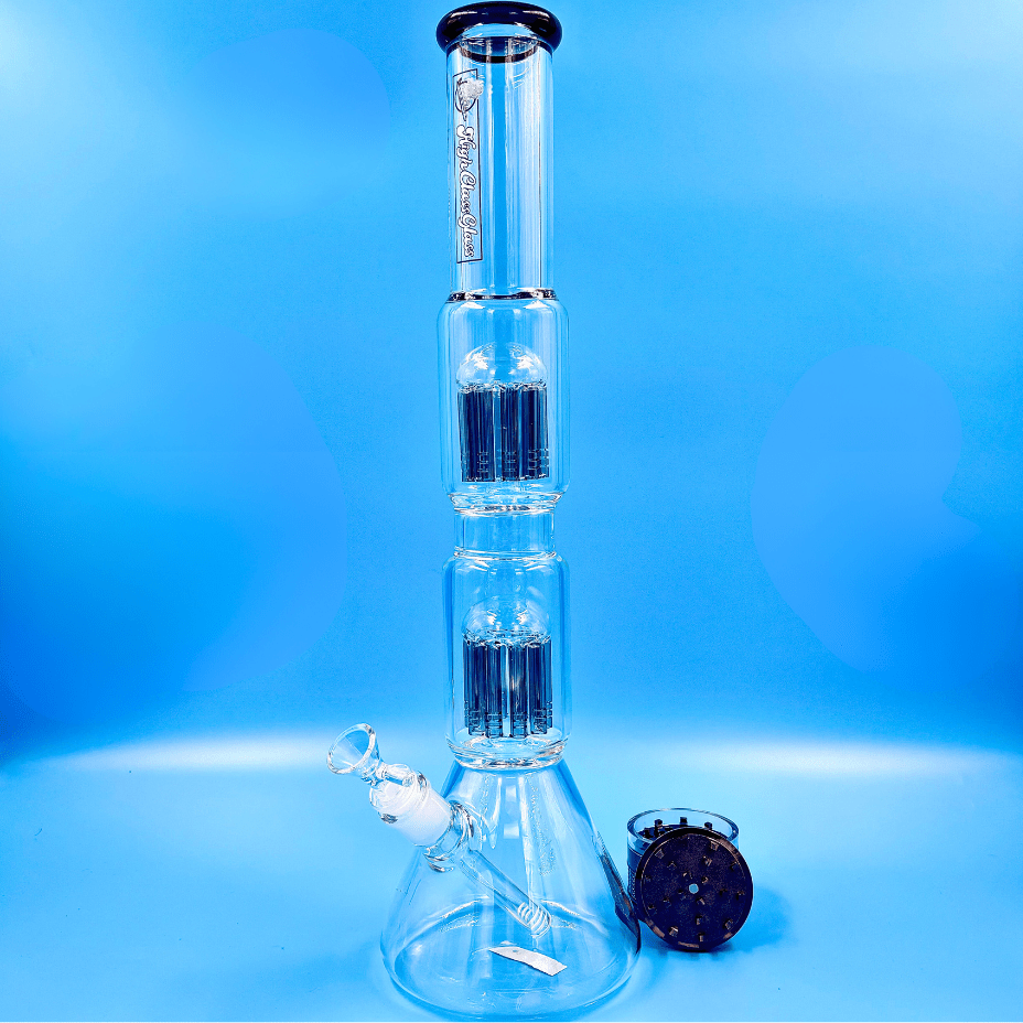 Shop the High Class Glass Double Perc Beaker- twice as nice without doubling the price! Crafted from durable 7mm borosilicate glass, this 19" beaker bong features dual 10-arm tree percolators for extra smooth hits. Not to mention, the wide beaker base for max water capacity. Includes a 150mm downstem and a 14mm cone pull out bowl, get ready to elevate your collection!