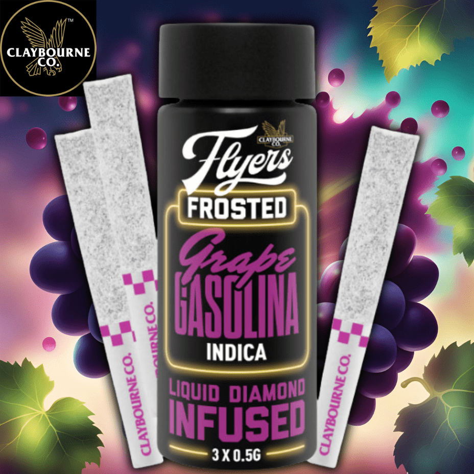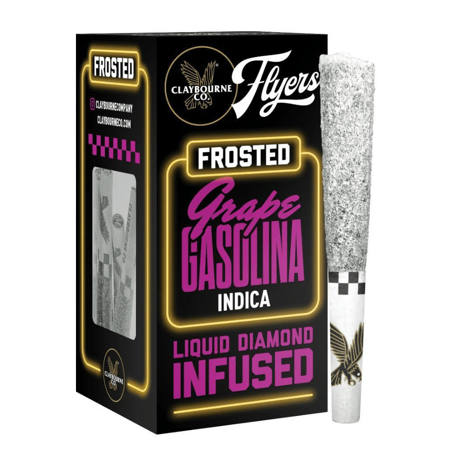 Claybourne Frosted Flyers Grape Gasolina Indica Infused Pre-rolls are highly potent coming in at a THC content of 42-45%. Giving off notes of fresh purple grape, spicy undertones and earthy notes on the exhale. These 3x0.5g pre-rolls are Indica-dominant and boast potency and flavor.