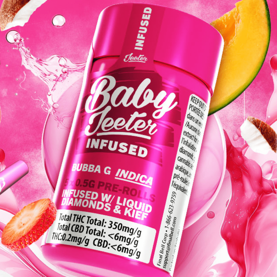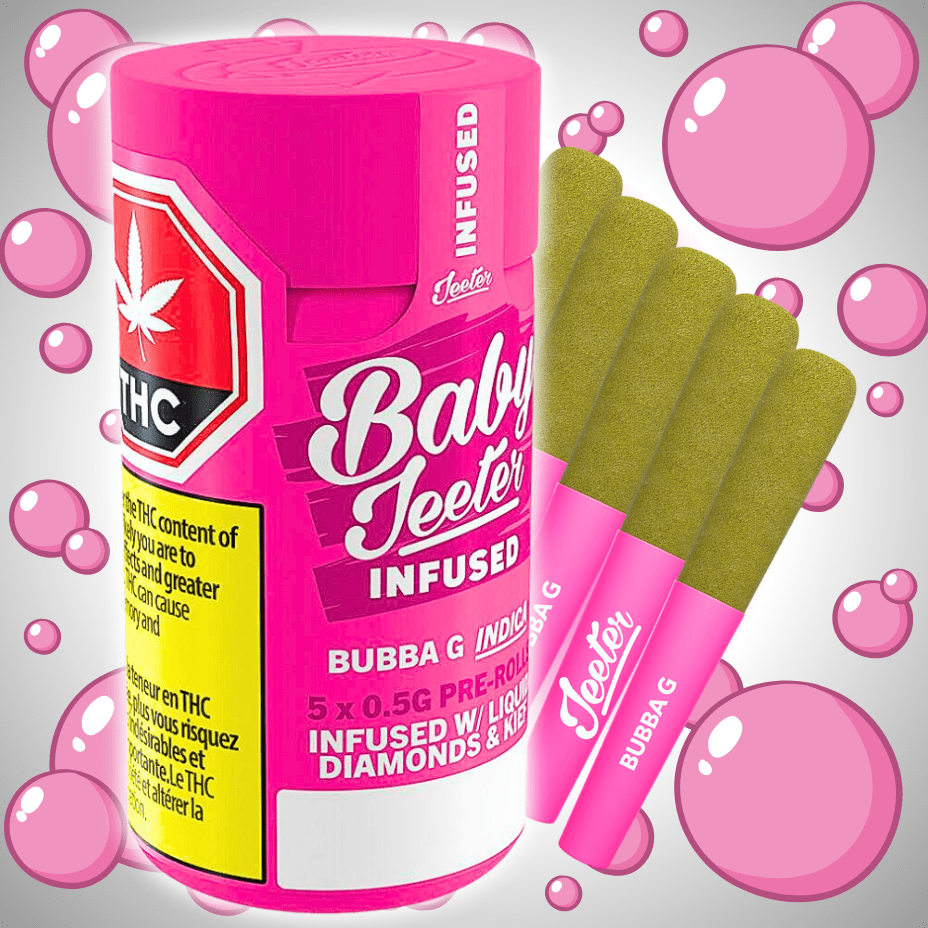 Baby Jeeter Bubba G Liquid Diamond Infused Pre-rolls are potent Indica Pre-rolls with a high THC content of 37-40%. Baby Jeeter Bubba G pre-rolls are infused with diamonds, crowned with a layer of kief and charged with a burst of unparalleled flavour.
