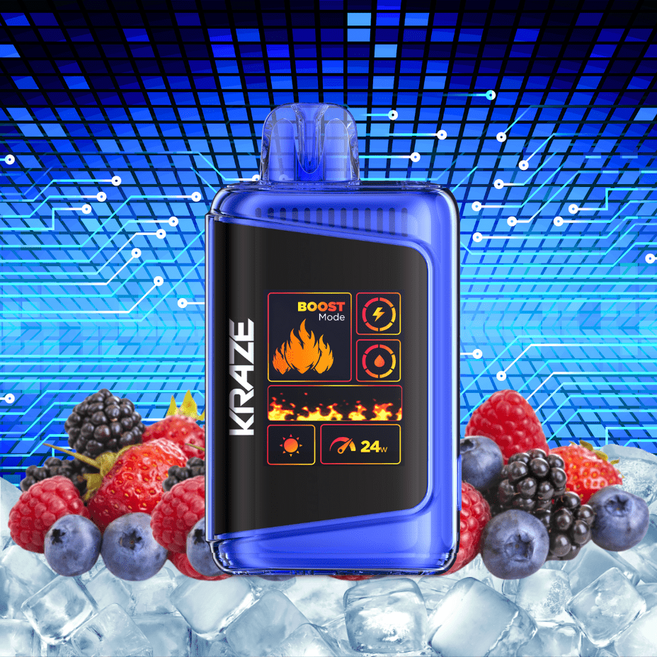 Kraze HD Mega 20k Triple Berry Ice disposable vape Packed with the perfect trio of berries, Sweet, Tart Pomegeranate, Bold, Ripe Blueberries and Juicy, Rich Strawberries finished with a perfectly chilled ice. These berries combine to make the perfect summer time vape! With up to 20,000 Puffs, Dual mesh coils and a very detailed 1.77" screen these are an absolute unit of a disposable!